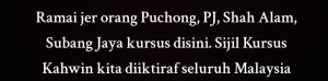 4 Kursus Kahwin Yang Selesa Di Kuala Lumpur KL UNTUK 1) Warga Kuala Lumpur , Taman Tun Dr Ismail TTDI Damansara Petaling Jaya Puchong Subang Shah Alam 2) Komuniti KL ,Gombak, Wangsa Maju Ampang Keramat Cheras. 4) Komuniti Putrajaya Bangi Sepang 3) Komuniti Sungai Besi Serdang Kajang CherasSijil JAWI Diiktiraf Seluruh Malaysia.